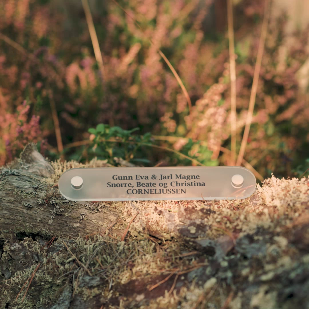 Et stort avlangt og avrundet dørskilt i akryl med plass til 3 tekstlinjer. Dersom du kun skriver en linje vil denne midtstilles. Monteres med avstandsstykker i rustfritt stål (medfølger).