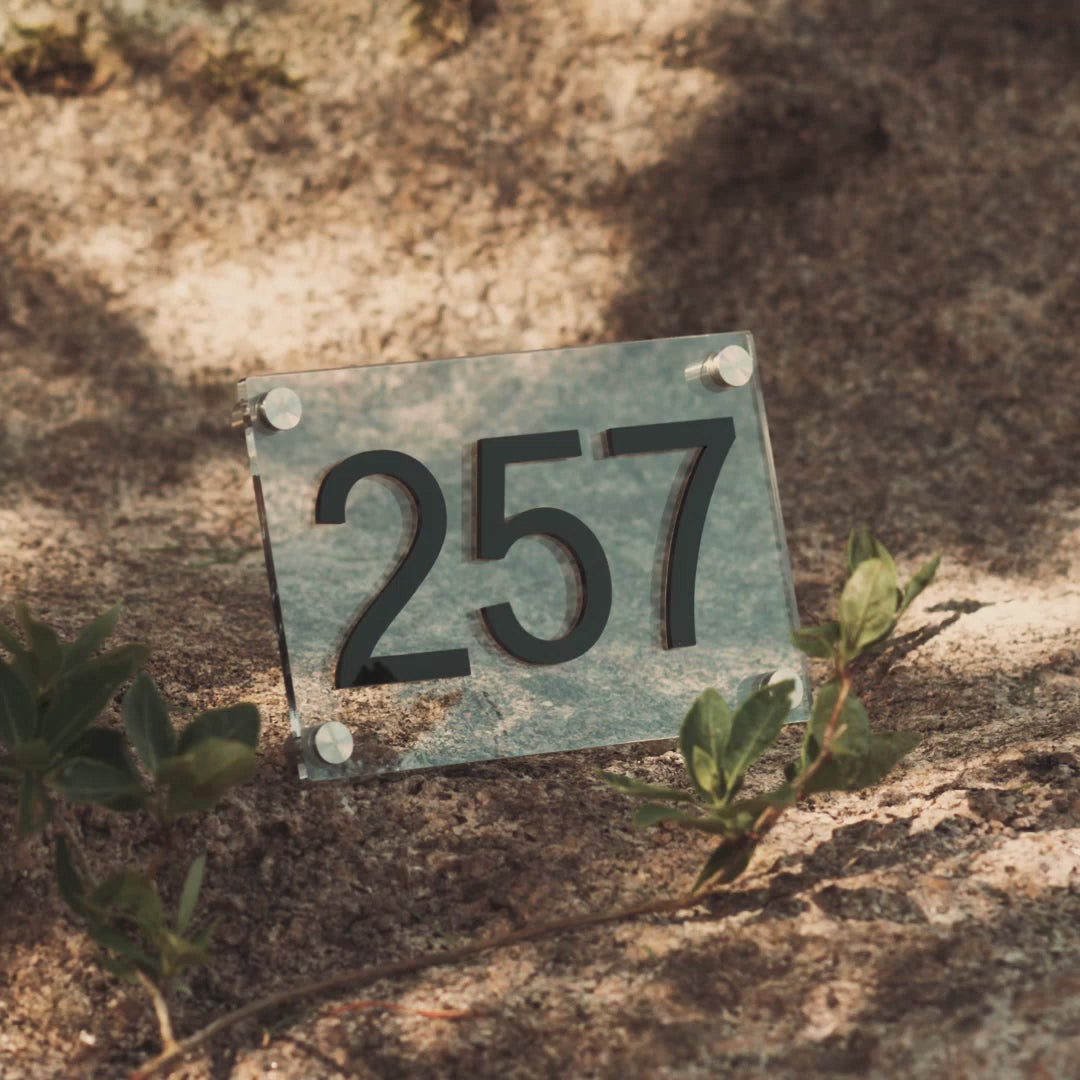 Skill deg ut med vårt eksklusive husnummerskilt av solid akryl med avstandsstykker i rustfritt stål. Skiltet gir et sofistikert og moderne touch til hjemmet ditt. Plass til 3 tegn (kun siffer og blokkbostaver).