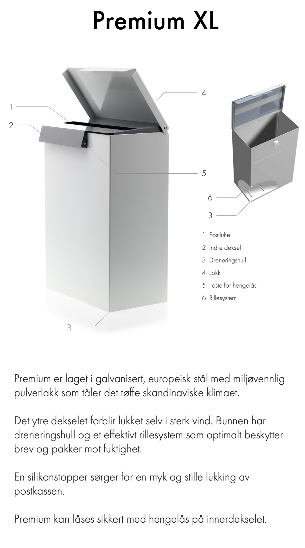 Premium XL – designet for Posten, er en postkasse med ekstra god plass til større sendinger. Den er laget av ekstra tykt, galvanisert europeisk stål og belagt med miljøvennlig pulverlakk med høy finish. Postkassen er en meget solid og stødig kasse som kan låses med hengelås på innerlokket.