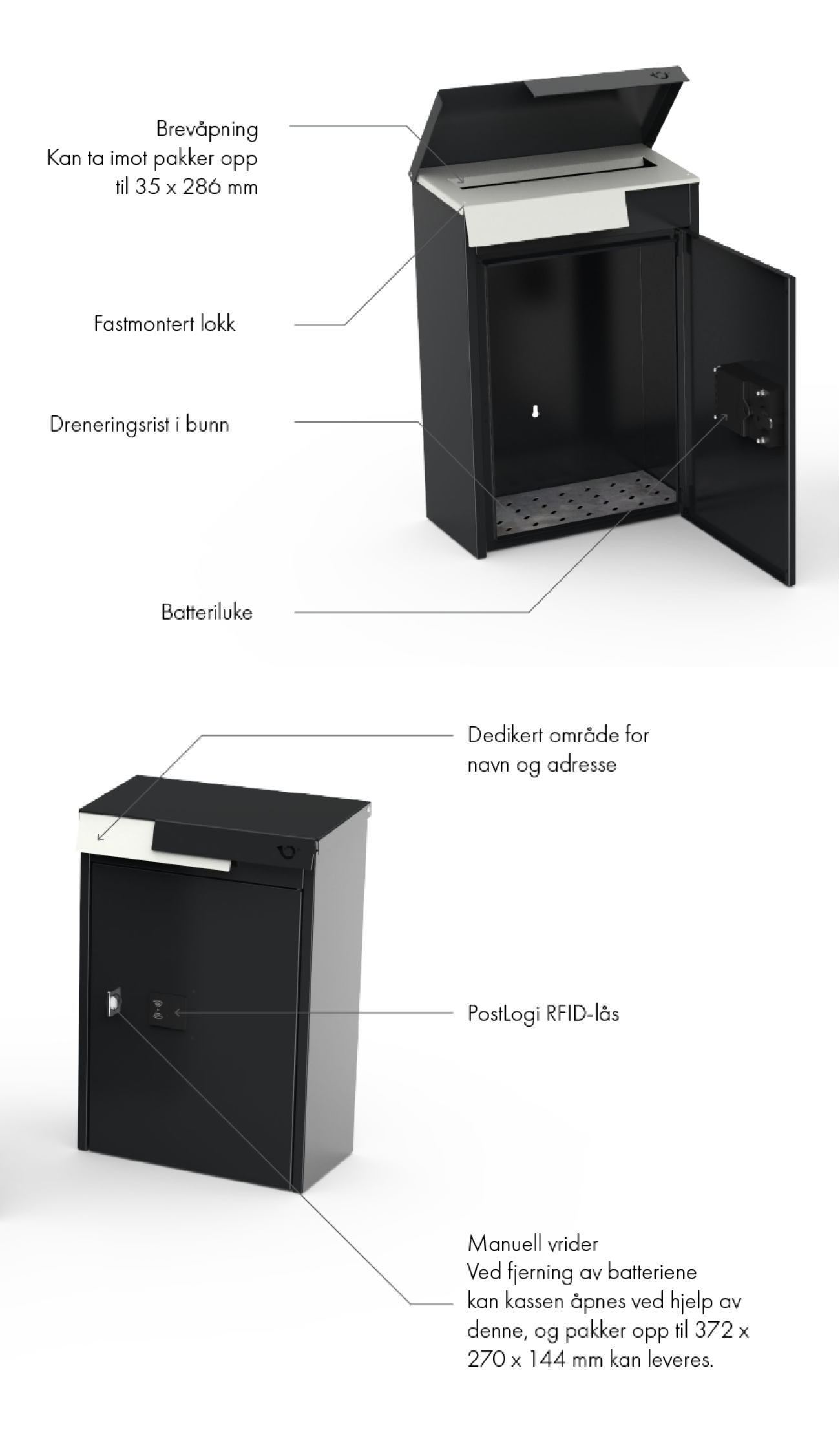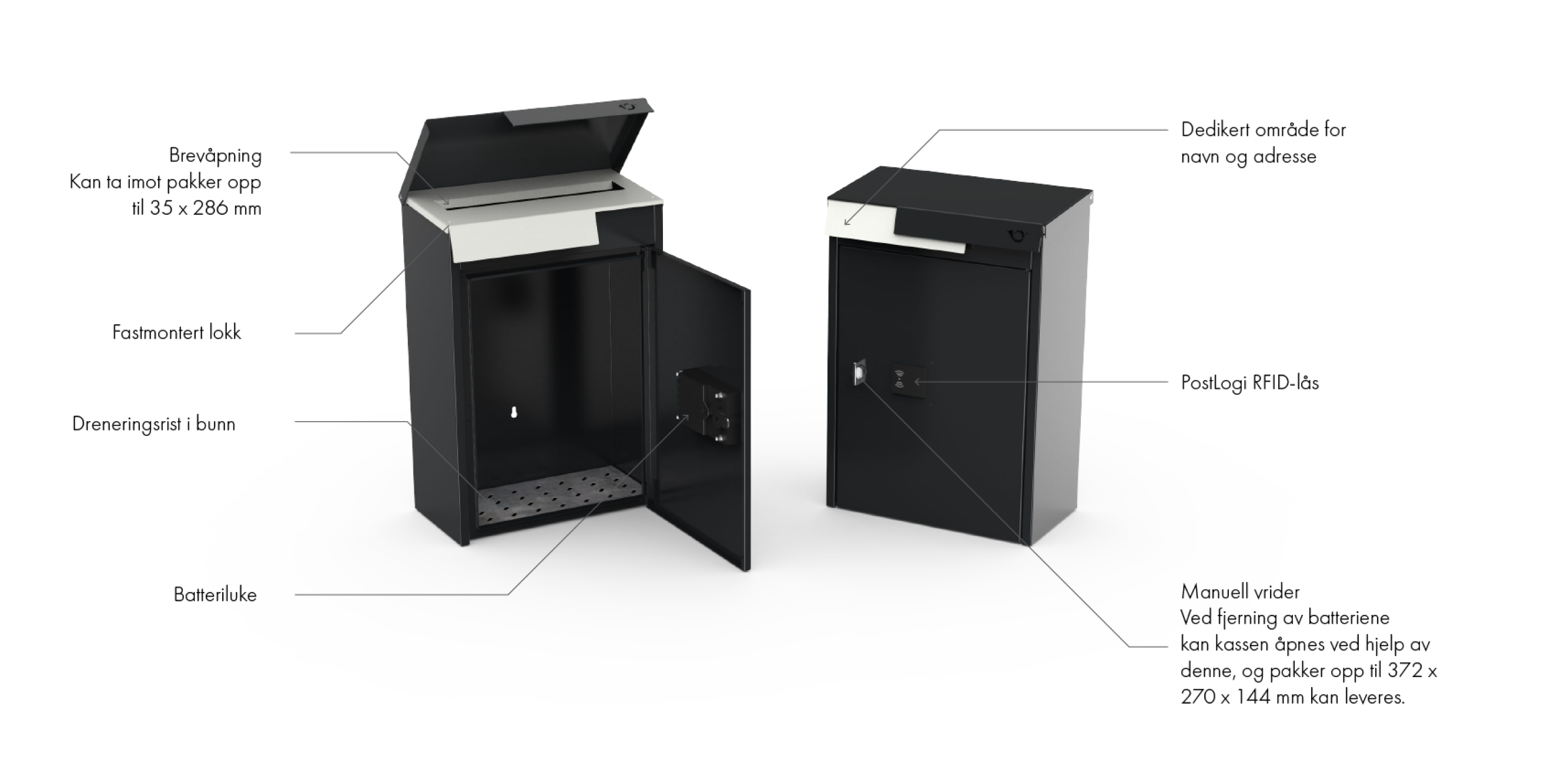 Innkastluken gir plass for brevsendinger og mindre pakker på inntil 3,5 x 28,6 cm. Skal større pakker leveres er det nødvendig å deaktivere låsen slik at postbudet kommer inn i luken foran.