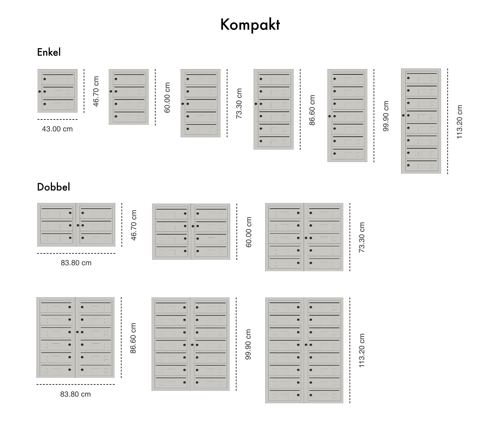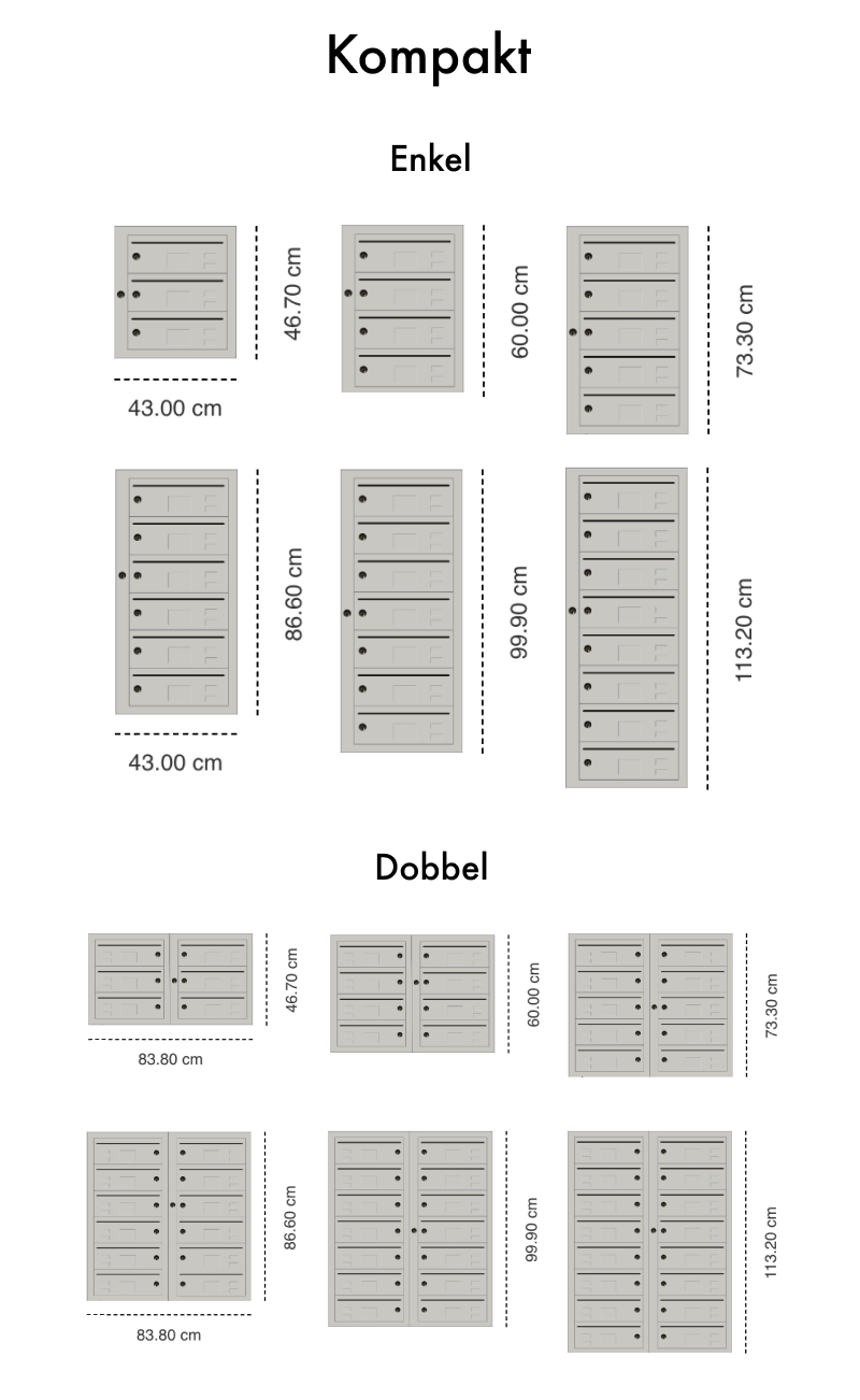 Liggende postkasser i lekker design som fungerer i de fleste oppganger og bygårder. Kompakt passer spesielt godt inn der det er behov for store postkasseanlegg, for effektiv bruk av veggareal. Med Kompakt leveres brev og pakker i trygt avlåste postkasserom, og den solide konstruksjonen gjør den til en av de sikreste postkassene på markedet.